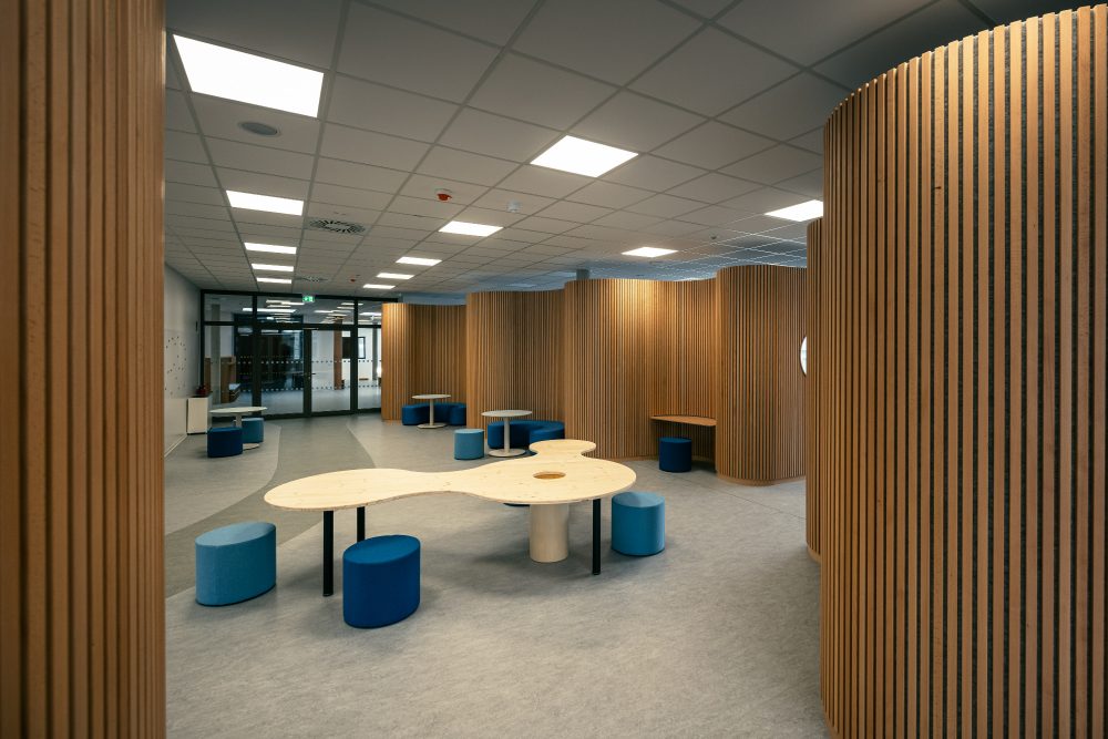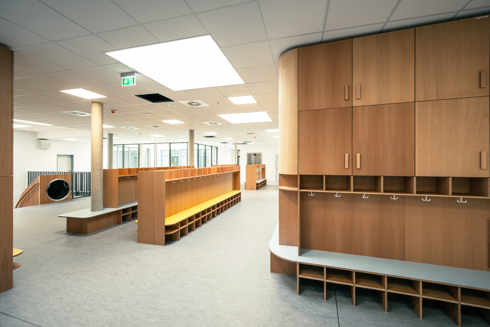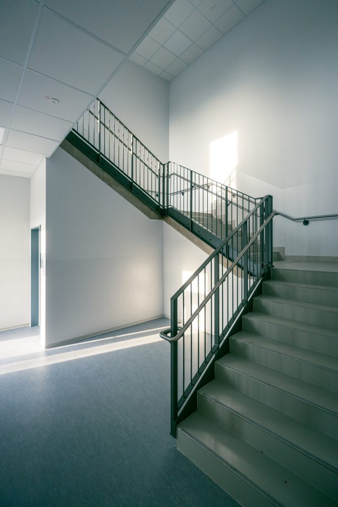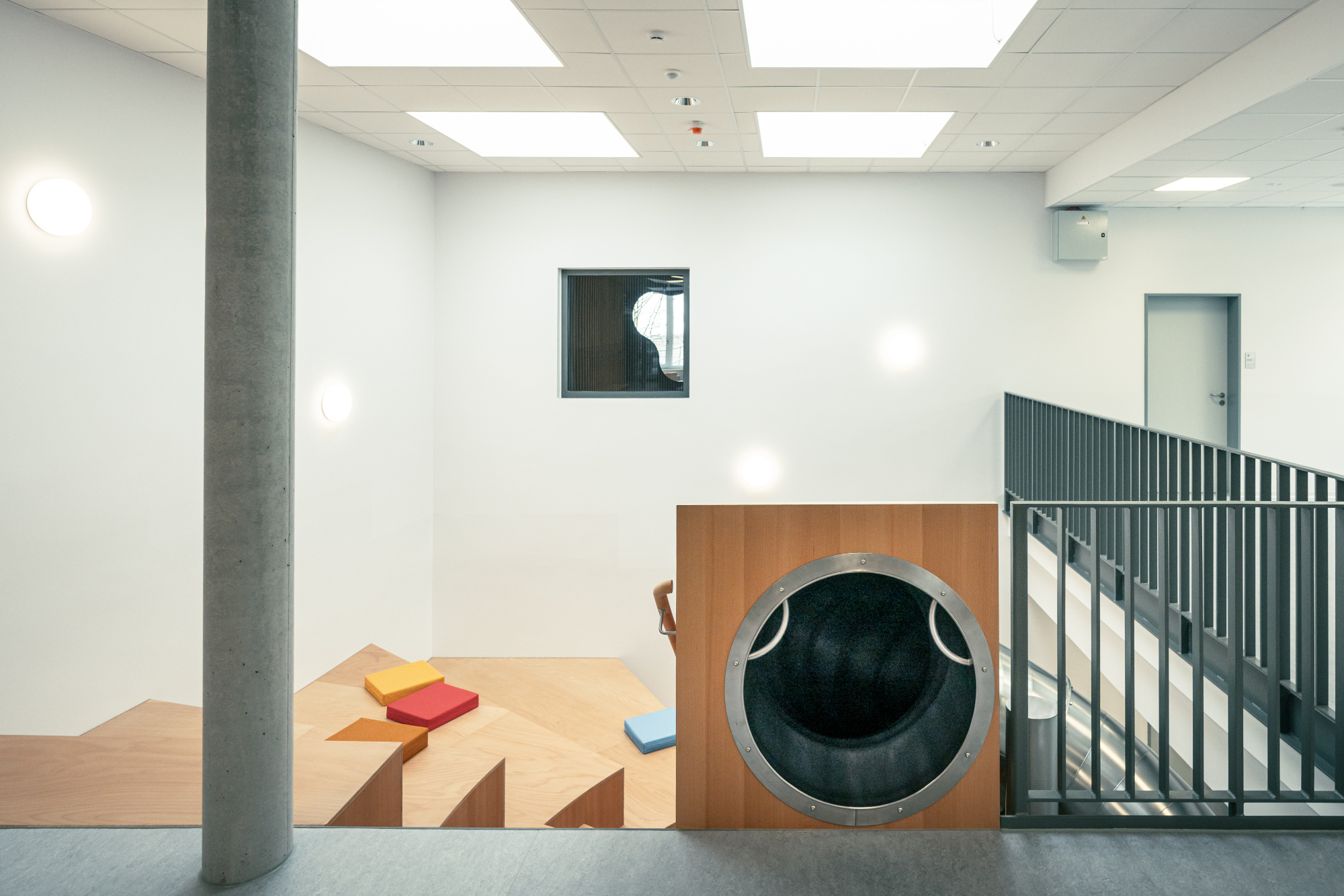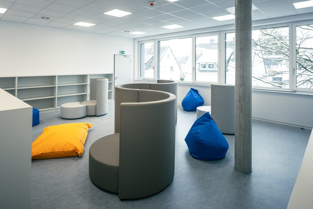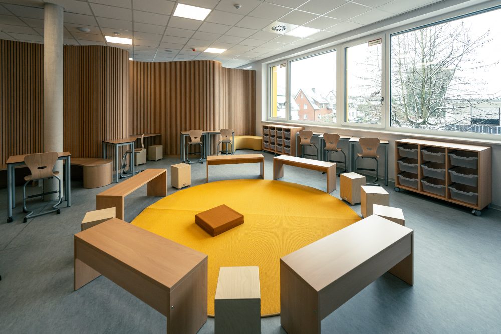 Im Neubau sind großzügige und offene Räumlichkeiten für 4 Bildungshäuser für ein zukunftsweisendes, neues Lernkonzept entstanden, welche sowohl horizontal als auch vertikal durch ein mittiges Foyer mit großer Sitz-Stufenanlage und Rutsche miteinander verbunden sind. Die Montagsstiftung begleitete das Projekt, in welchem die sechs Raumgestaltungsprinzipien nach Rosan Bosch realisiert wurden. Jedem Bildungshaus ist eine bestimmte Farbfamilie zugeordnet. Im zentralen Foyer als Treffpunkt ergibt sich dann ein buntes Farbspiel.