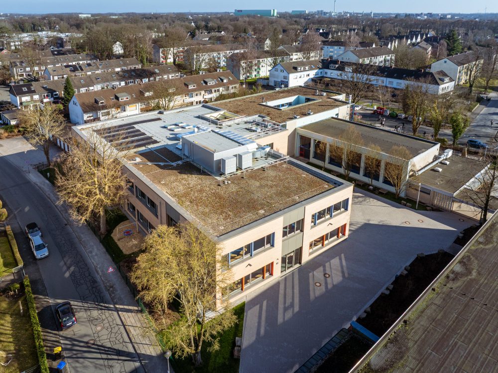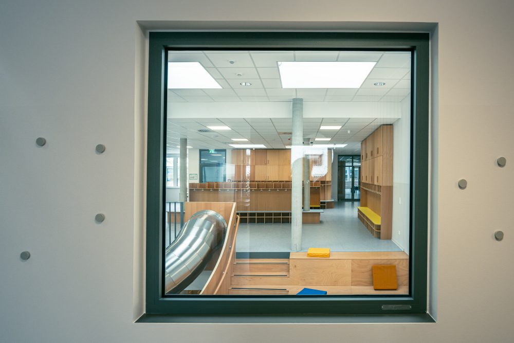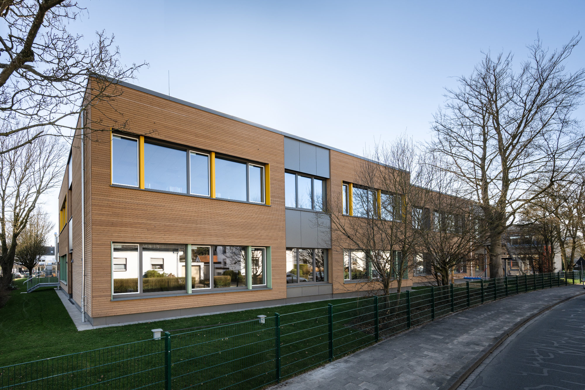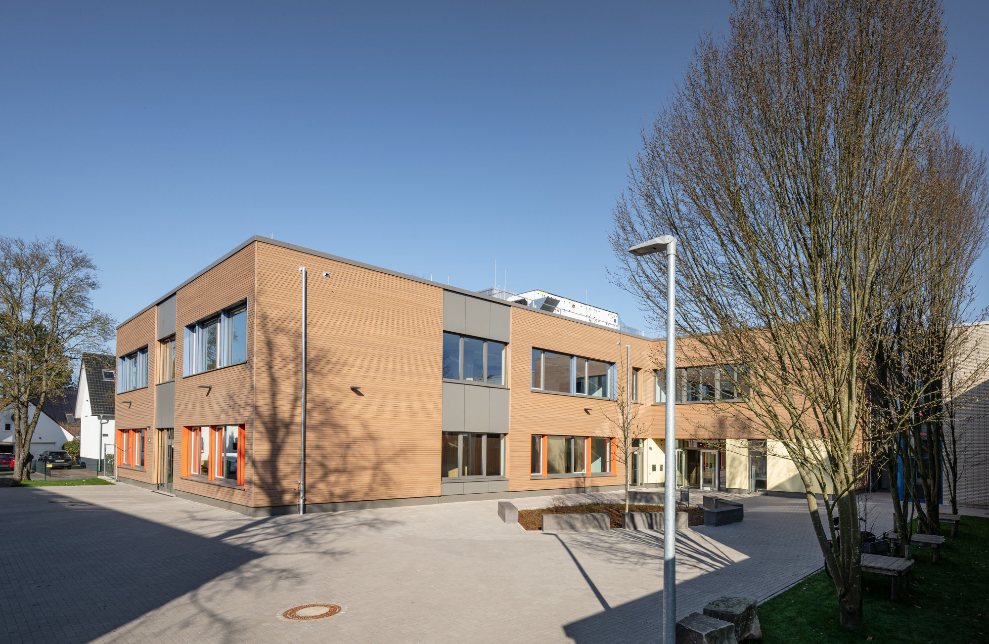 Die Fassade des Neubaus wurde mit einer ökologisch wertvollen Lärchenholzschalung versehen. Auch hier finden sich die bunten Farbakzente im Bereich der Fenster wieder. Die Technik wurde in einer Technikzentrale auf dem Dach des Neubaus verortet, welches im restlichen Bereich mit einem Gründach und einer PV-Anlage ausgestattet ist. Im Bestandsbau befinden sich der Verwaltungstrakt, die neue Küche, der Speiseraum, eine Schulküche und weitere Kreativräume.